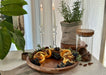 - Material: Recycled glass bases with reclaimed acacia wood tops
