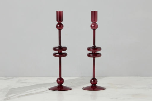 Elevate your home decor with a pair of Merlot Glass Candlesticks. These expertly crafted dark red taper candle holders add a touch of timeless eleg...